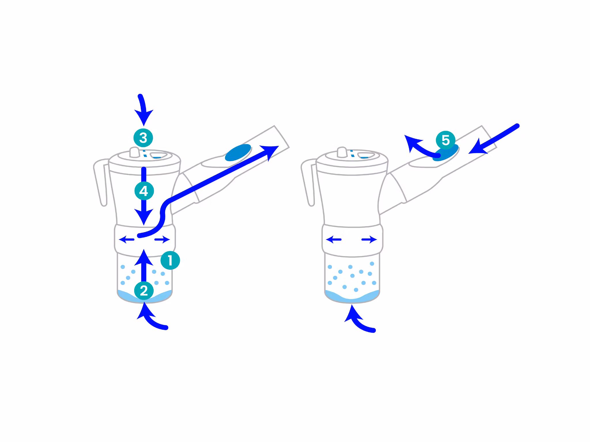 Användning: Öppna nebulisatorn genom att vrida den motsols och fyll den med korrekt mängd vätska (saltlösning/förskrivet läkemedel) och stäng den sedan genom att vrida den medsols. Anslut den ena delen av luftslangen i botten av nebulisatorn och den andra delen i apparaten som beskrivs i bruksanvisningen. Välj tillbehör (mask, mun-/nässtycke) och sätt fast det direkt på nebulisatorn. Anslut apparatens kontakt till nätuttaget. För att starta behandlingen tryck på startknappen. Medeljet Plus-nebulisatorns andningsförstärkta dubbelventilsystem garanterar hög effektivitet och minimalt läkemedelsspill.