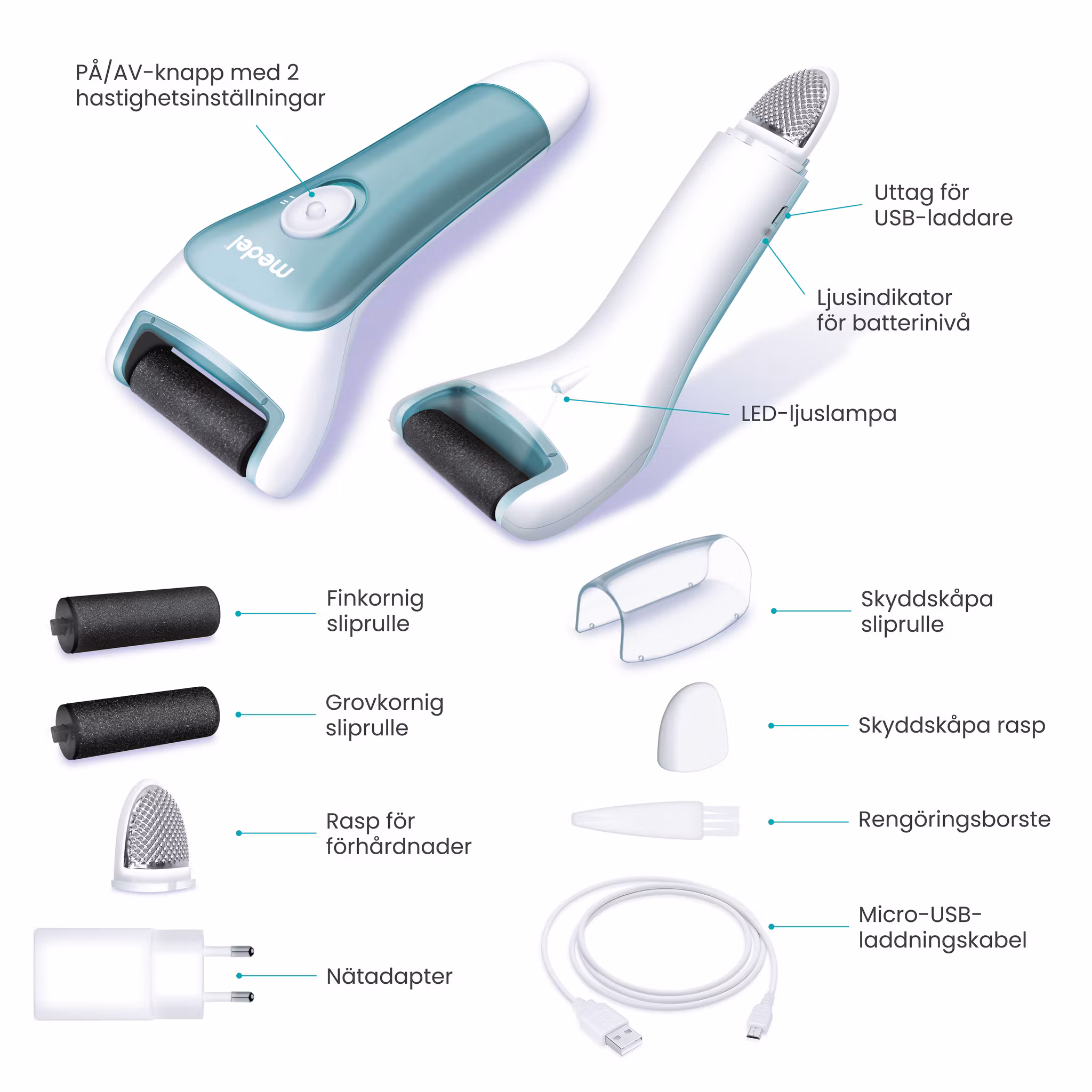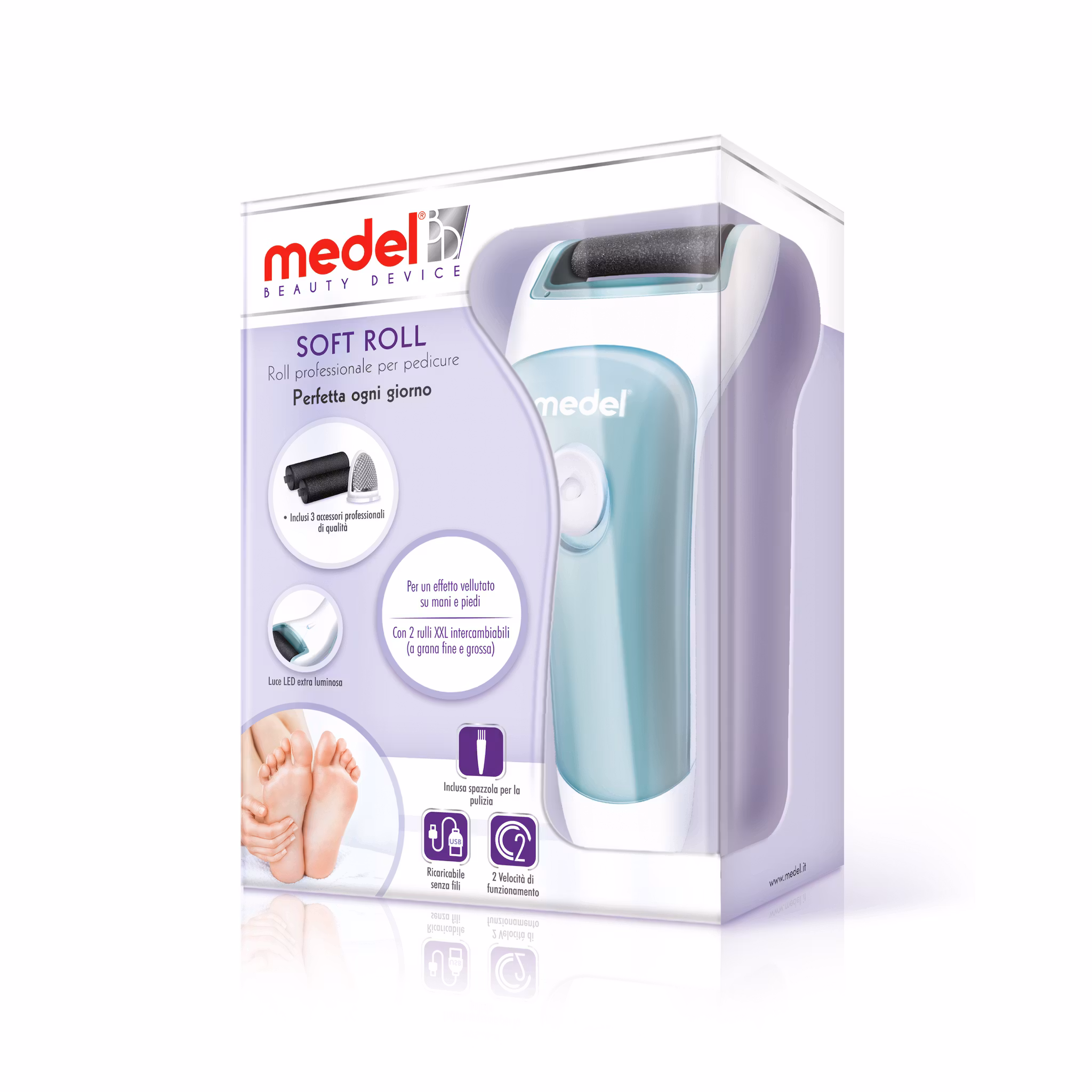 Beskrivning: Medel Soft Roll är en professionell elektrisk fotslip för borttagning av hård och grov hud samt förhårdnader och ger lena fötter. Till fotslipen medföljer tre verktyg, två utbytbara sliprullar, en finkornig och en grovkornig samt en fast rasp under locket i botten av fotslipen. Slipen har två hastigheter, LED-ljus och uppladdningsbart batteri. Kan användas både med batteridrift och nätansluten.