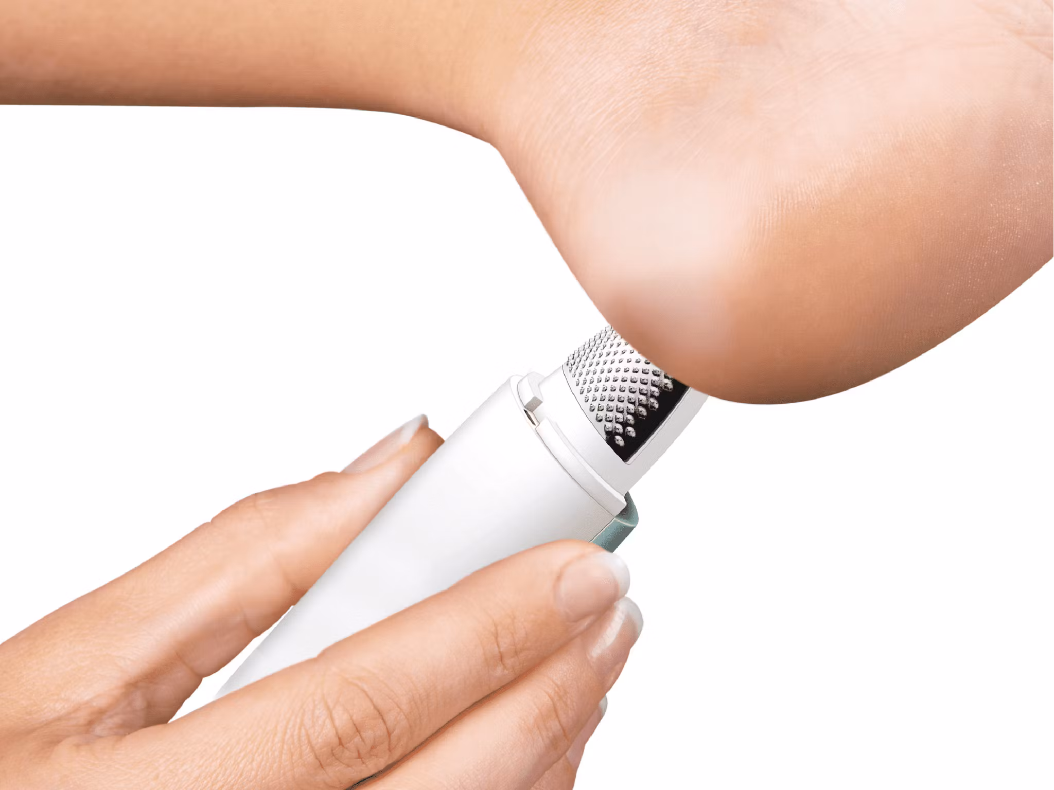 - För att ta bort mindre förhårdnader och/eller jämna ut huden och ge den en len yta används den finkorniga sliprullen.