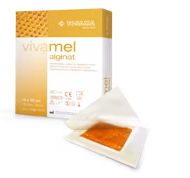 Beskrivning: Vivamel Alginat sårkompress med medicinsk kastanjehonung är en steril kompress av kalciumalginat helt impregnerad med medicinsk kastanjehonung. Kalciumalginat utvinns ur brunalger. Alginatkompressen är avsedd för vård och behandling av ett stort spektra sår i olika läkningsfaser. Den är särskilt lämplig för svårläkta sår, som läker dåligt eller långsamt. Alginatkompressen är högabsorberande och lämplig för sår med medelstor till stor avsöndring av sårvätska. Om mer honung behövs i sårkompressen kan man använda Vivamel steril medicinsk honung i tub som komplement. Vivamel medicinsk kastanjehonung har ursprung i EU.