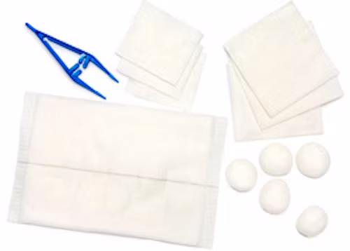 Innehåll: 3st kompresser av gasväv 7,5x7,5cm, 3st kompresser av gasväv 10x10cm, 1st bomullsunderlägg 25x15cm, 5st tamponader, 1st pincett